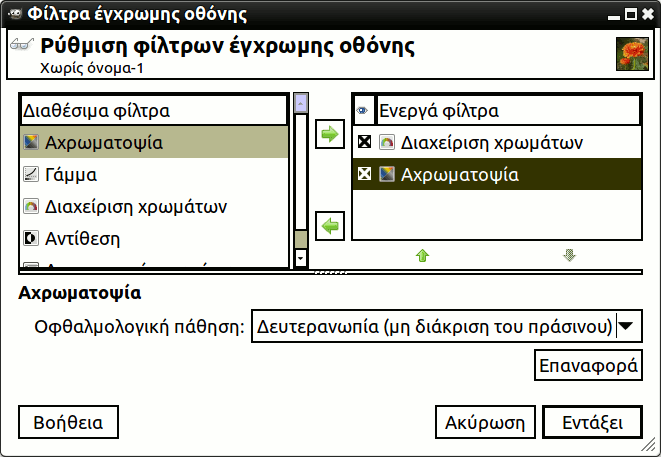 Αυτή η εντολή δείχνει ένα παράθυρο διαλόγου όταν εκτελείται. Αυτό το παράθυρο μπορεί να χρησιμοποιηθεί για τη διαχείριση των φίλτρων εμφάνισης και των επιλογών τους. Τα φίλτρα εμφάνισης δεν πρέπει να συγχέονται με τα φίλτρα στο μενού . Τα φίλτρα εμφάνισης δεν μεταβάλουν τα δεδομένα της εικόνας, αλλά μόνο μια εμφάνιση της. Μπορείτε να φανταστείτε τα φίλτρα εμφάνισης σαν μεγάλα παράθυρα πριν την οθόνη σας. Αλλάζουν την αντίληψη της εικόνας. Αυτό μπορεί να είναι χρήσιμο για πράγματα όπως προσομοιώσεις εκτύπωσης, έλεγχο της διαχείρισης χρώματος, αλλά επίσης προσομοίωση της ελαττωματικής όρασης χρώματος.