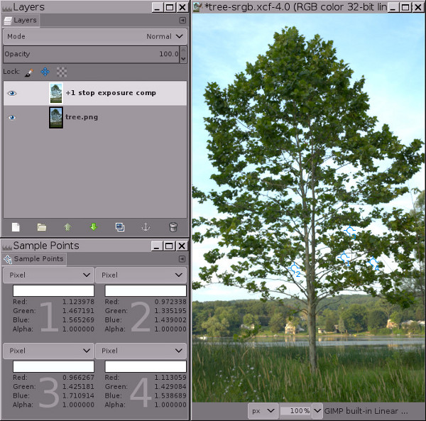 Open tree.png with GIMP and assign the GIMP built-in sRGB profile (the image colors won’t change a bit). Then convert the image to 32-bit floating point linear precision: Select → → , and in the Encoding Conversion dialog, select Linear light (this ensures that the Normal blend mode produces radiometrically correct results).