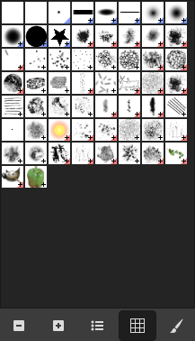 In the center a grid view of all available brushes appears, with the currently selected one outlined.