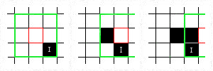 In this image, the studied pixel has a red border and the studied 3×3 matrix has a green border. Thus when the pixel marked with „I“ is inside the green border, the studied pixel turns to black.