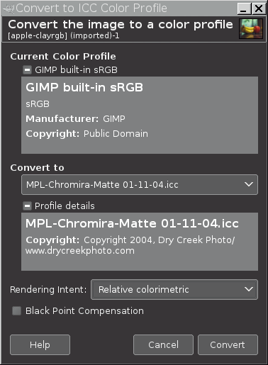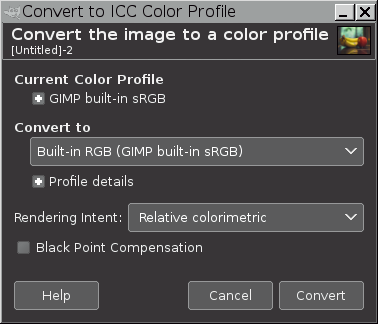 the profile in the Convert to box defaults to a GIMP