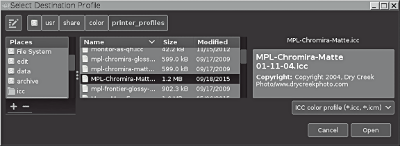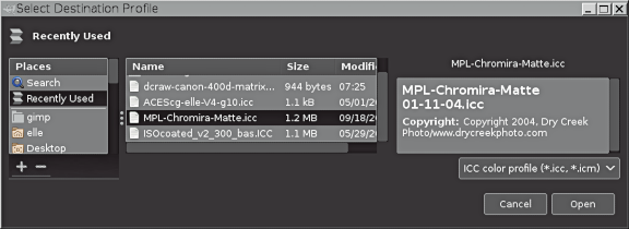 Clicking on Select color profile from disk… brings up the dialog for navigating to the disk location of the profile that you want to select from disk. The box has three panels:
