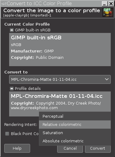 Choose a rendering intent from the Rendering Intent drop-down box. The ICC profile rendering intents are: