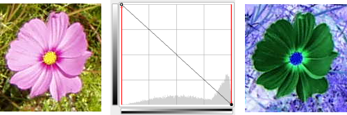 Black is made White (fully colored / fully opaque). White is made black (black, fully transparent). All pixels adopt the complementary color. Why that? Because subtracting the channel values from 255 gives the complementary color. For example: 19;197;248 a sky blue gives 255-19; 255-197; 255-248 = 236;58;7, a bright red.