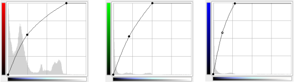 The curve represents the quantity of color in each of the three RGB channels. Here, dark means little of the color. Light means a lot of the color.