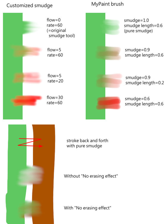 We already saw the different behavior of the Flow option when it is set to 0.00 (works as the original Smudge tool) and set to more than 0.00 (uses the foreground color for smudging).