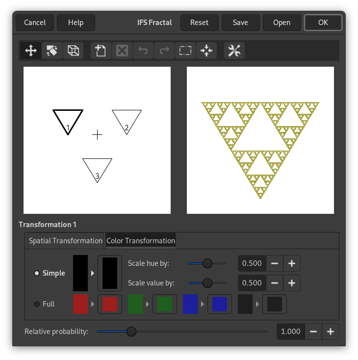The plug-in interface consists of the compose area to the left, a preview screen to the right, and some tabs and option buttons at the bottom of the dialog. The Default setting (in the preview window) is three equilateral triangles. (This gives rise to a fractal pattern called the Sierpinski Triangle).