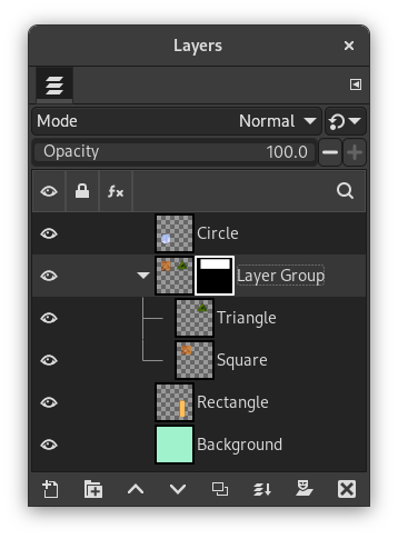 You can create a layer group by clicking the button at the bottom of the Layers Dialog, by using the menu command → , or through the Layers dialog context menu.
